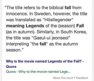 스웨덴과 프랑스어판 제목도 <Légendes d'automne>로 '가을의 전설'이라는 뜻이지만 원작자 짐 해리슨은 가을뿐 아니라 몰락, 타락의 의미를 부여한 것이 맞다고 밝혔습니다.