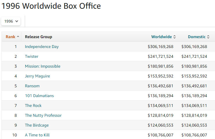 제작비 7500만 달러로 미국 독립기념일에 맞춰 개봉해 역대 첫 주말 오프닝 2위를 기록하여 결국 미국에서만 3억 달러가 넘는 수입을 올렸고, 해외 5억 1천만 달러를 합쳐 8억 1700만 달러가 넘는 흥행 대박을 거둬들였으며 한국 흥행 1위를 비롯해 전세계적으로 그 해 영화 흥행 1위를 기록했습니다.