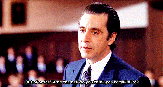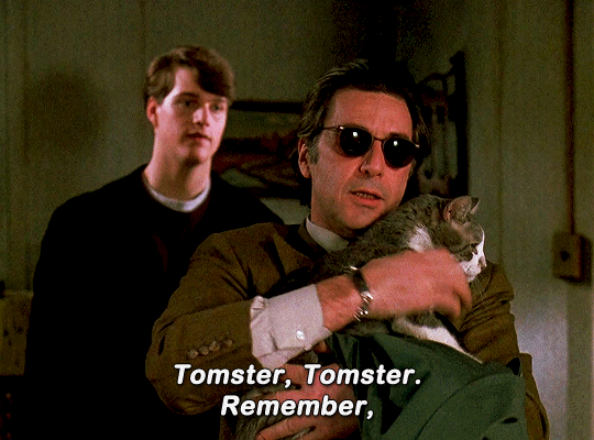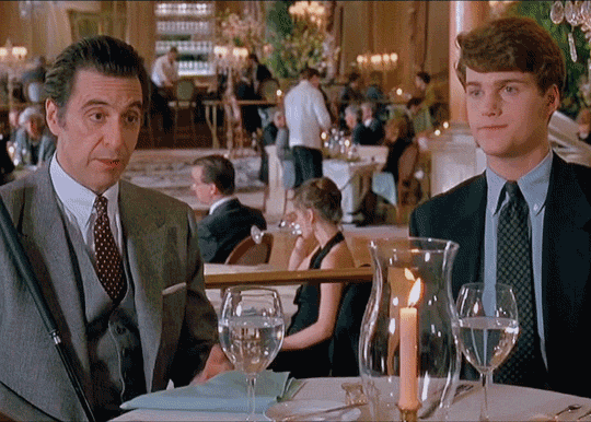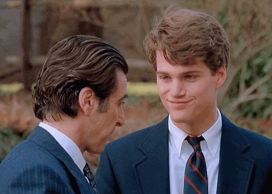 마지막 징계 회의 장면 중에 교장 트래스크가 프랭크에게 'You are out of order!'(지나칩니다!)라고 말하자, 프랭크가 'I'll show you out of order!'(지나친걸 보여주겠소!)라고 되받아치는 대사가 있는데 이 'You are out of order!'라는 대사는 알 파치노의 최종 변론 명연기로도 유명한 <용감한 변호사>에서도 나온 대사이며 알 파치노의 연기 커리어에서 기억에 남는 명대사 중 하나로 평가됩니다.