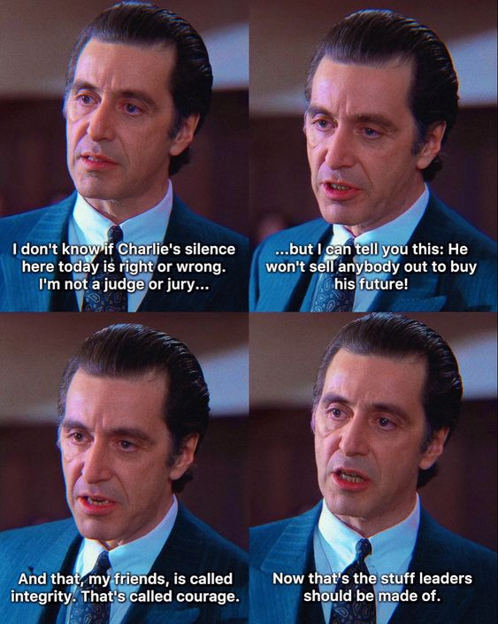 정작 최고의 명장면은 알파치노가 학교위원회에 출석하여 ‘누군가의 뒤에숨어 하는 교활한 짓을 감싸지말고 그에 당당히 맞서는 학생을 보호하라’는 거침없는 변론을 펼치는 장면에서 격렬하게 일침을 가하는 연기는 영화가 말하고자 한 모든 것이 함축되어 있습니다.