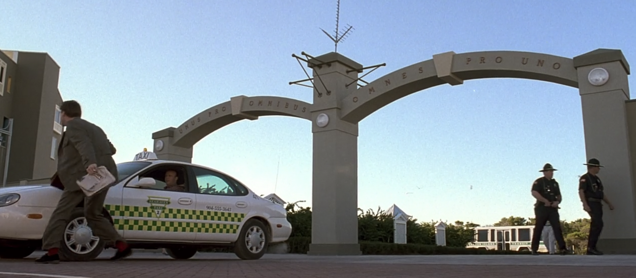 영화 초반 짐 캐리가 죽은 줄만 알았던 아버지가 탄 버스를 쫓는 데 실패했을 때, 어느 표어가 새겨진 대문 앞에 서게 되는데, 이 표어는 'Unus pro omnibus, omnes pro uno(모두를 위한 한 사람, 한 사람을 위한 모두)'이며 알렉상드르 뒤마의 '삼총사'에서 언급될 정도로 유명한 라틴어 표어이지만 트루먼 쇼의 내용을 생각하면 소름 돋는 장면입니다.