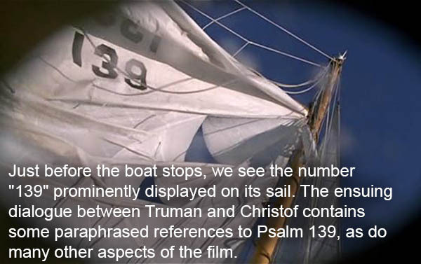 곳곳에 트루먼이 도촬당하고 있다는 암시와 묘사가 보이며, 작중 후반부에 트루먼이 스튜디오를 벗어나기 위해 사용하는 보트의 이름이 '산타 마리아'이고 산타 마리아 호엔 "139"라는 숫자가 쓰여있는데 이는 곧 트루먼을 감시하는 크리스토프를 기독교의 신으로 묘사한 것으로, 성경의 시편 139장을 의미하며 시편 139장 중 트루먼 쇼와 관련이 있는 절은 2절에서 4절